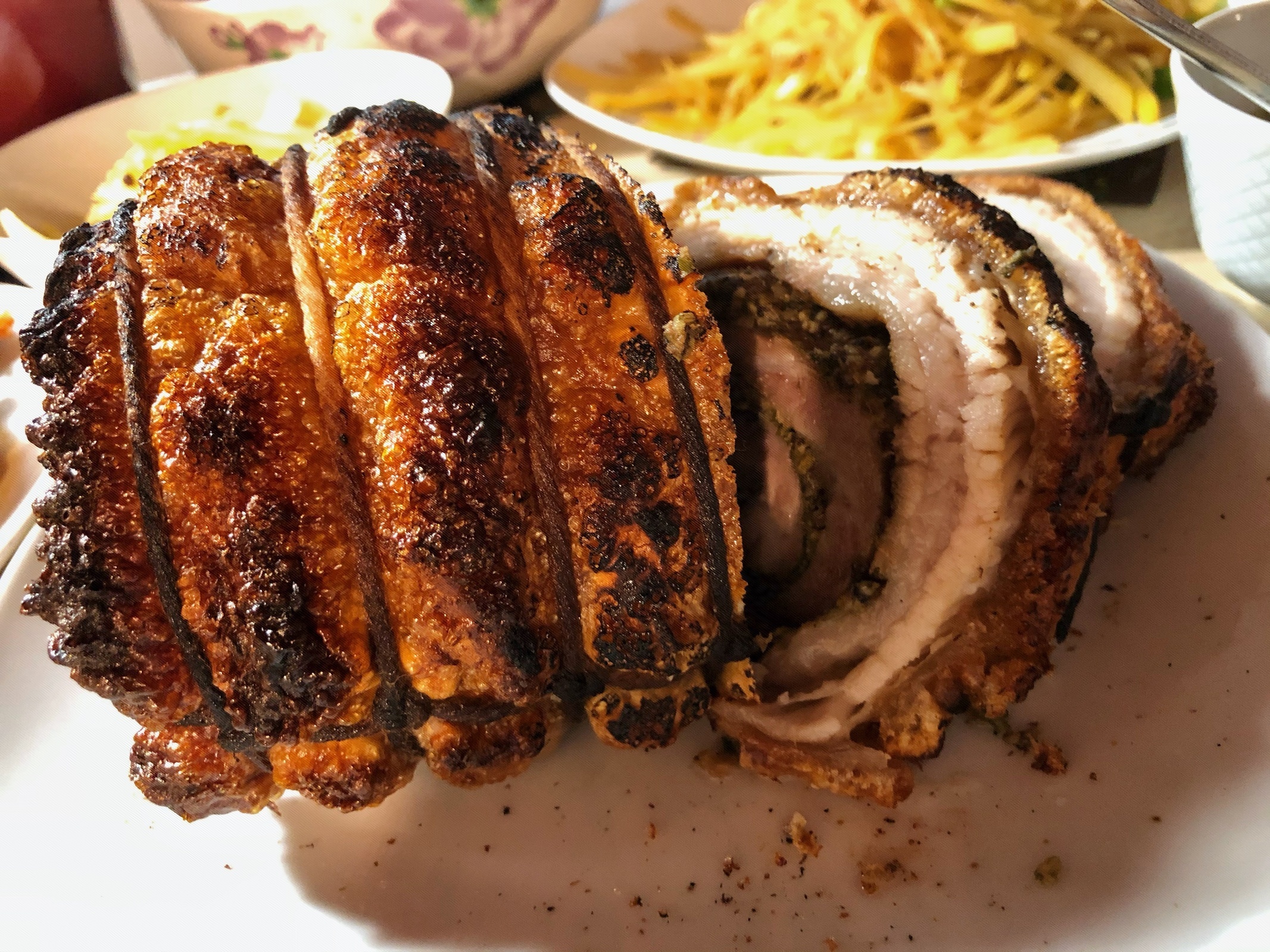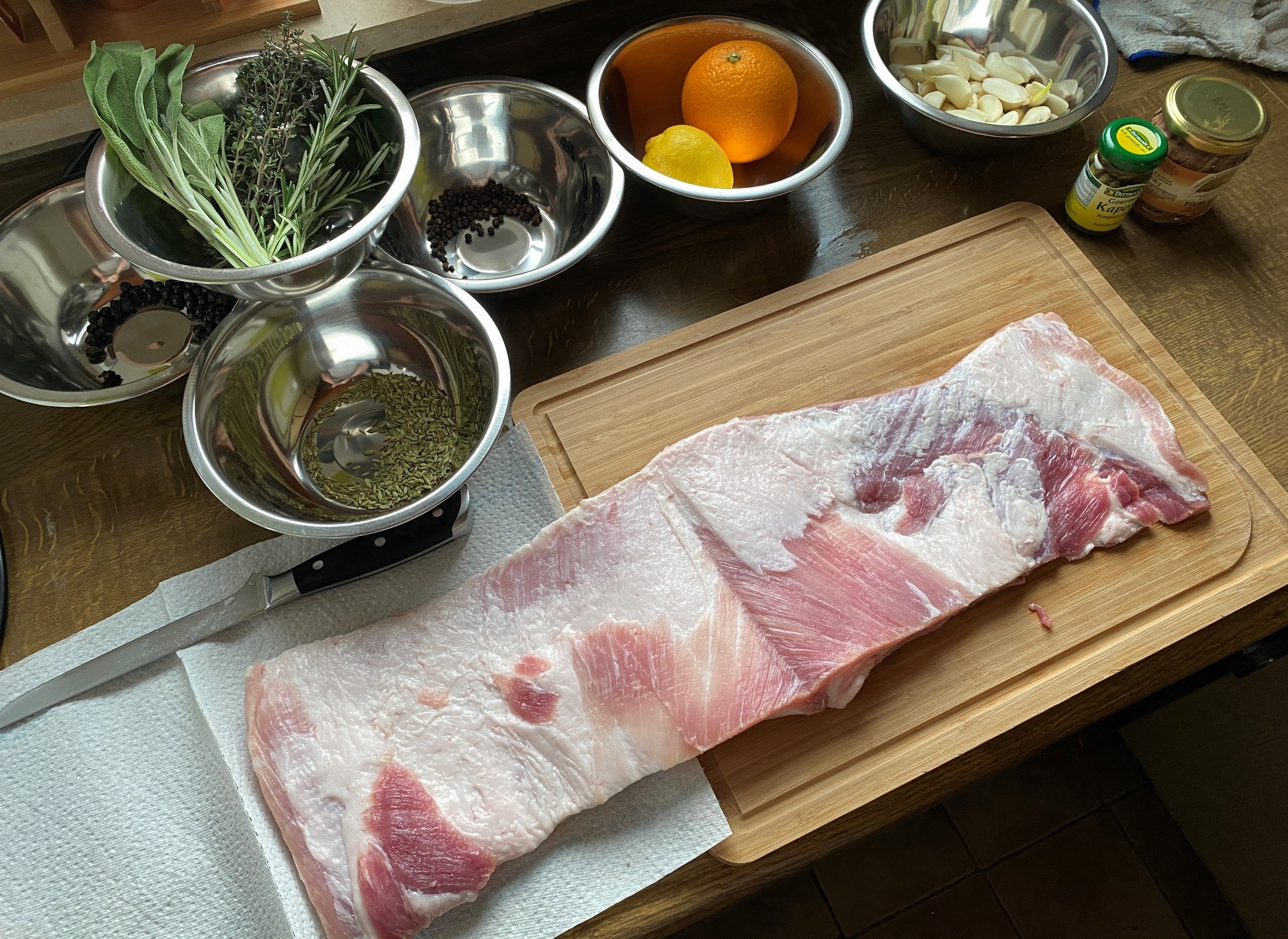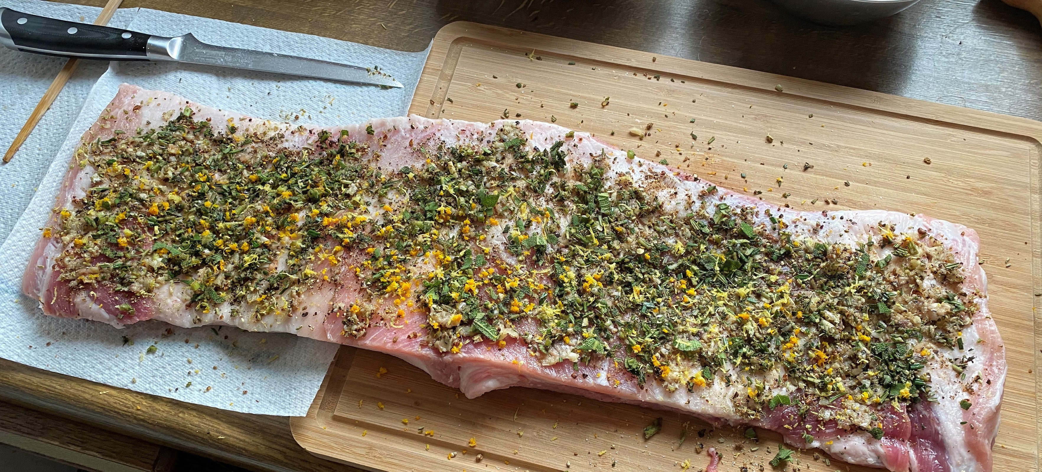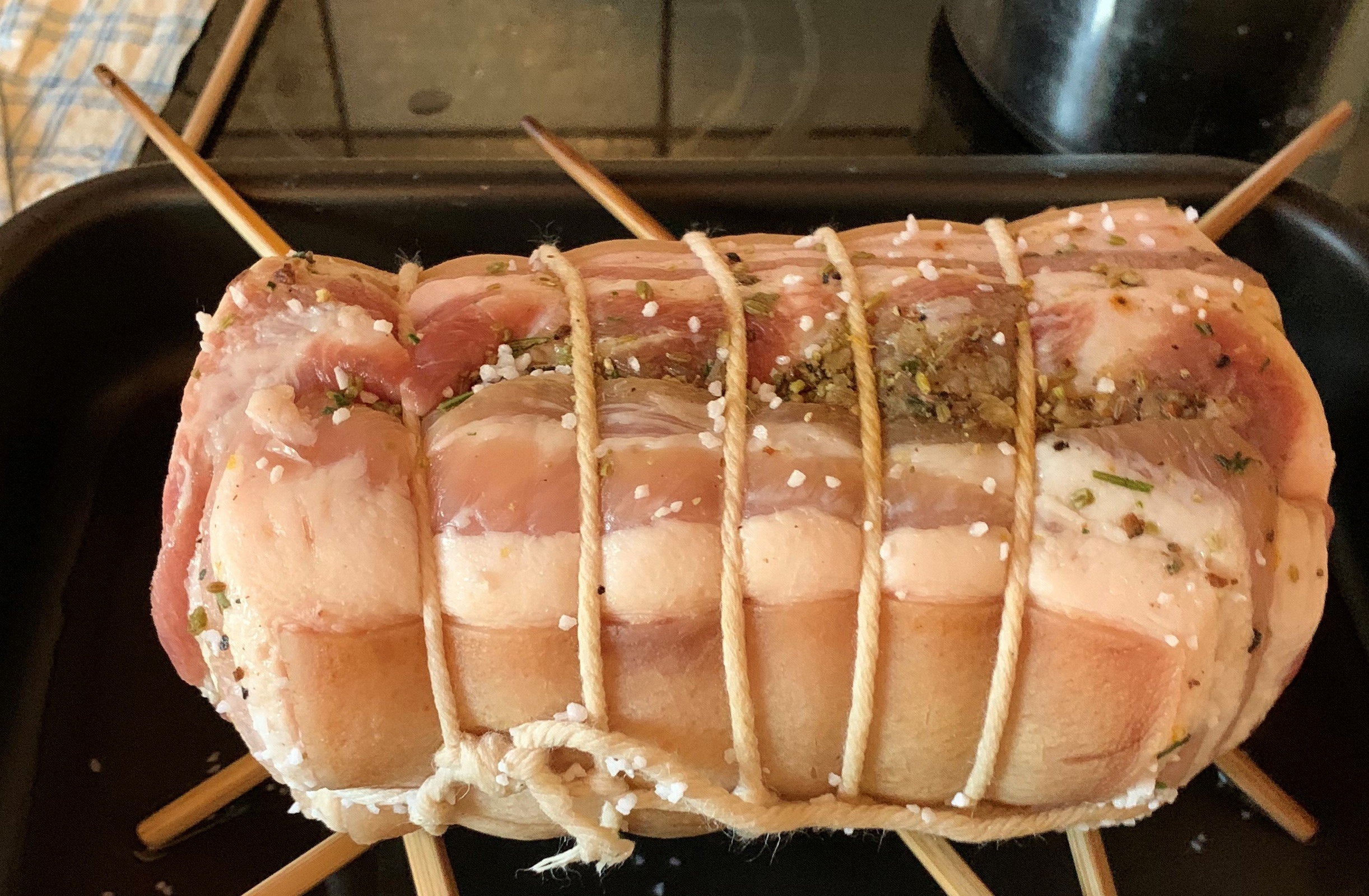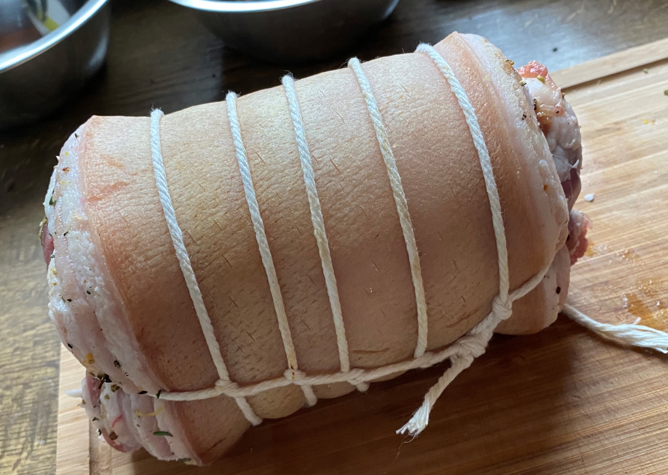 - 将肉,卷起来,猪皮在最外层,用屠夫结捆绑(Butchers Knot)