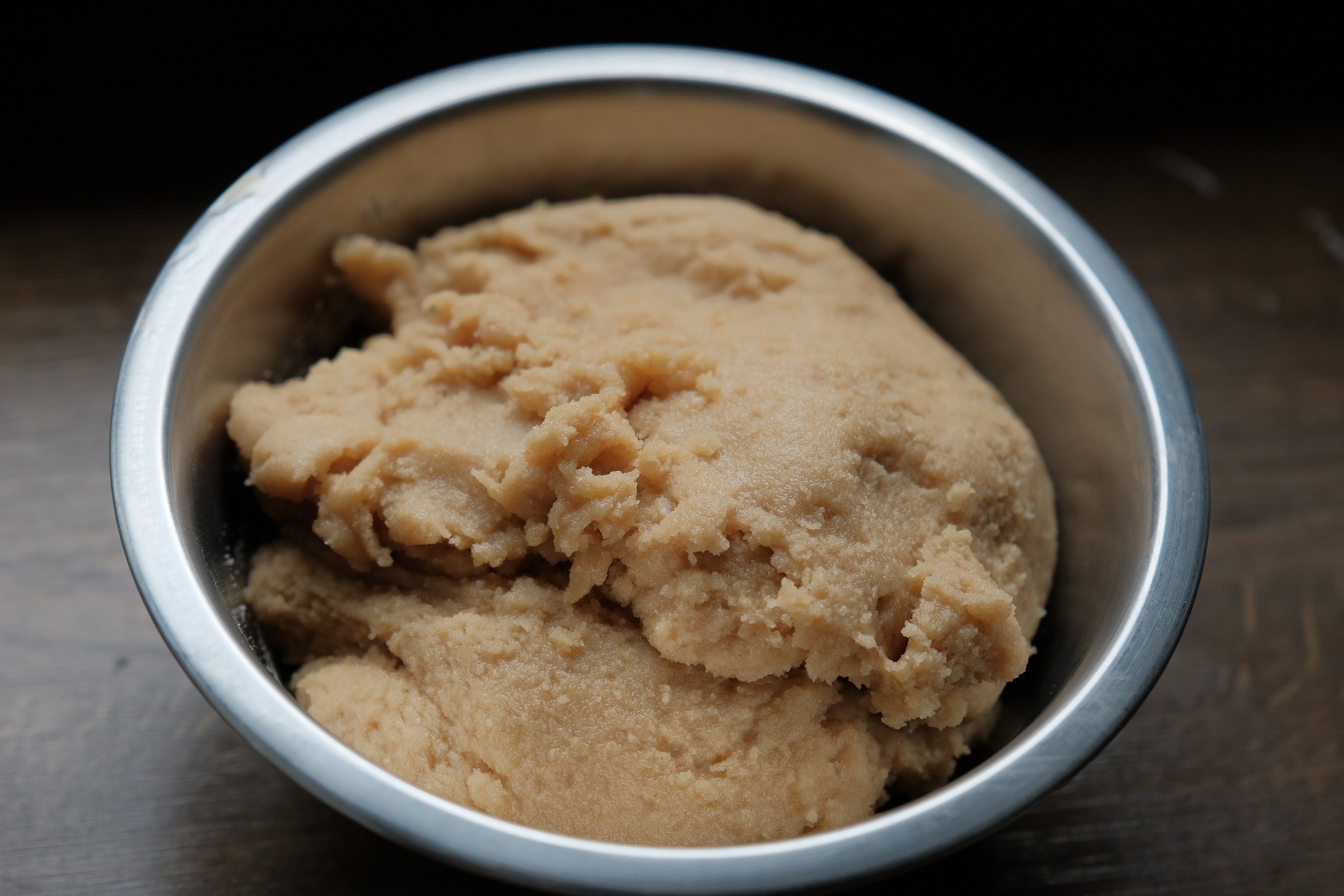 - 逐渐加入炒熟糯米粉,充分混合,可以适量调整用量以调节粘性