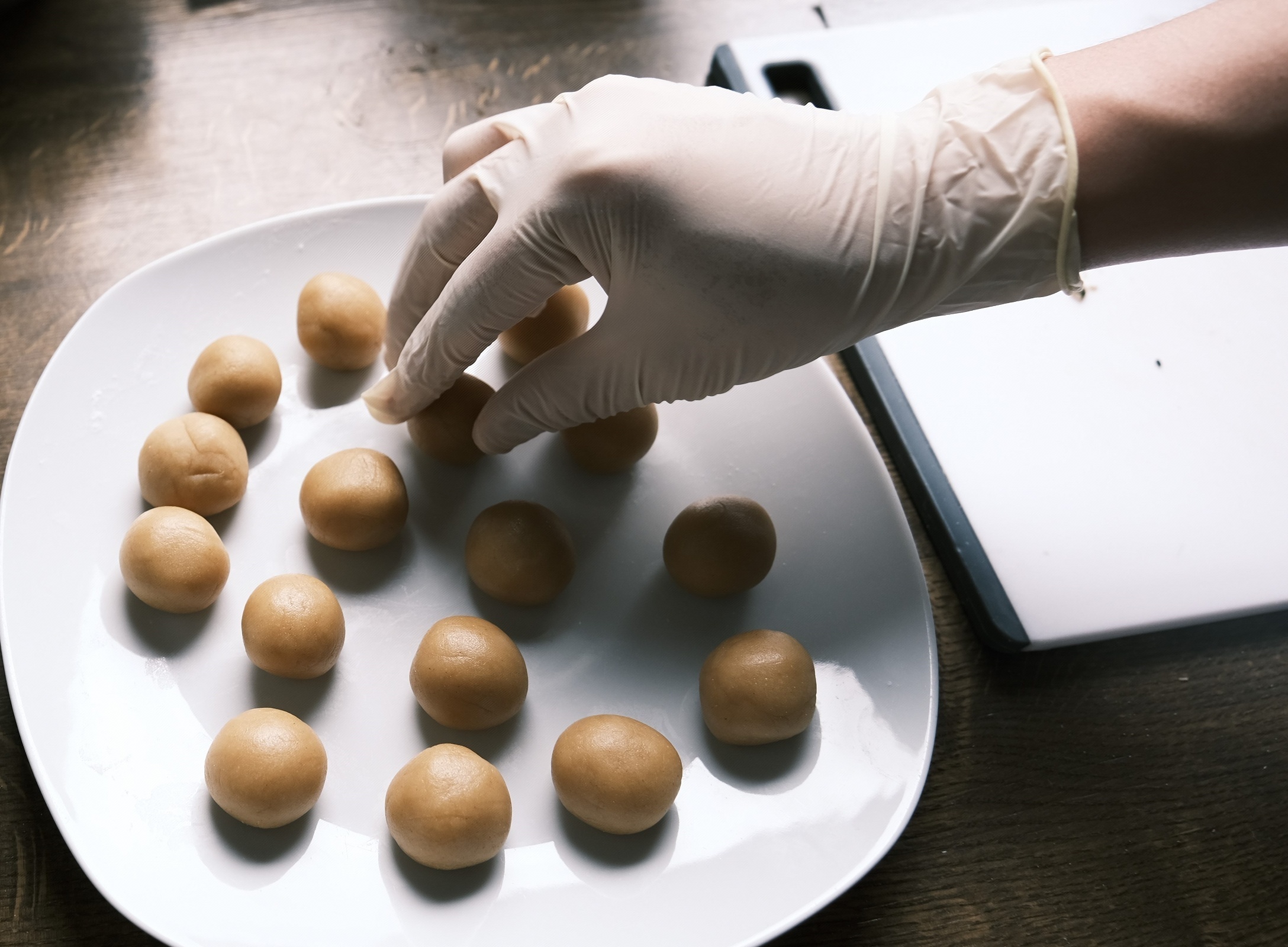 - 使用乳胶手套(饼皮被体温加热后会非常黏),蘸取少量淀粉,将饼皮捏薄,包裹内陷,如同包包子一样,向上收口,搓圆。