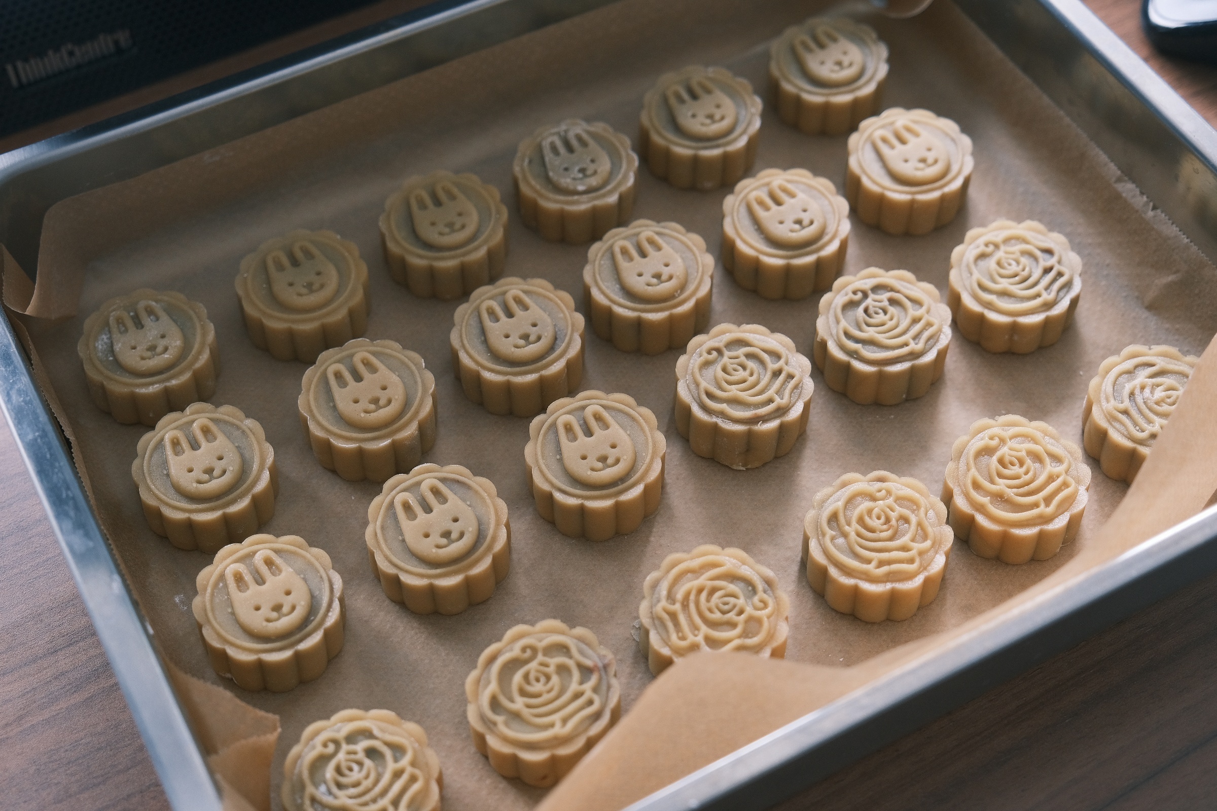 - 使用少量淀粉涂布饼胚,用磨具压制。放置于烤盘。