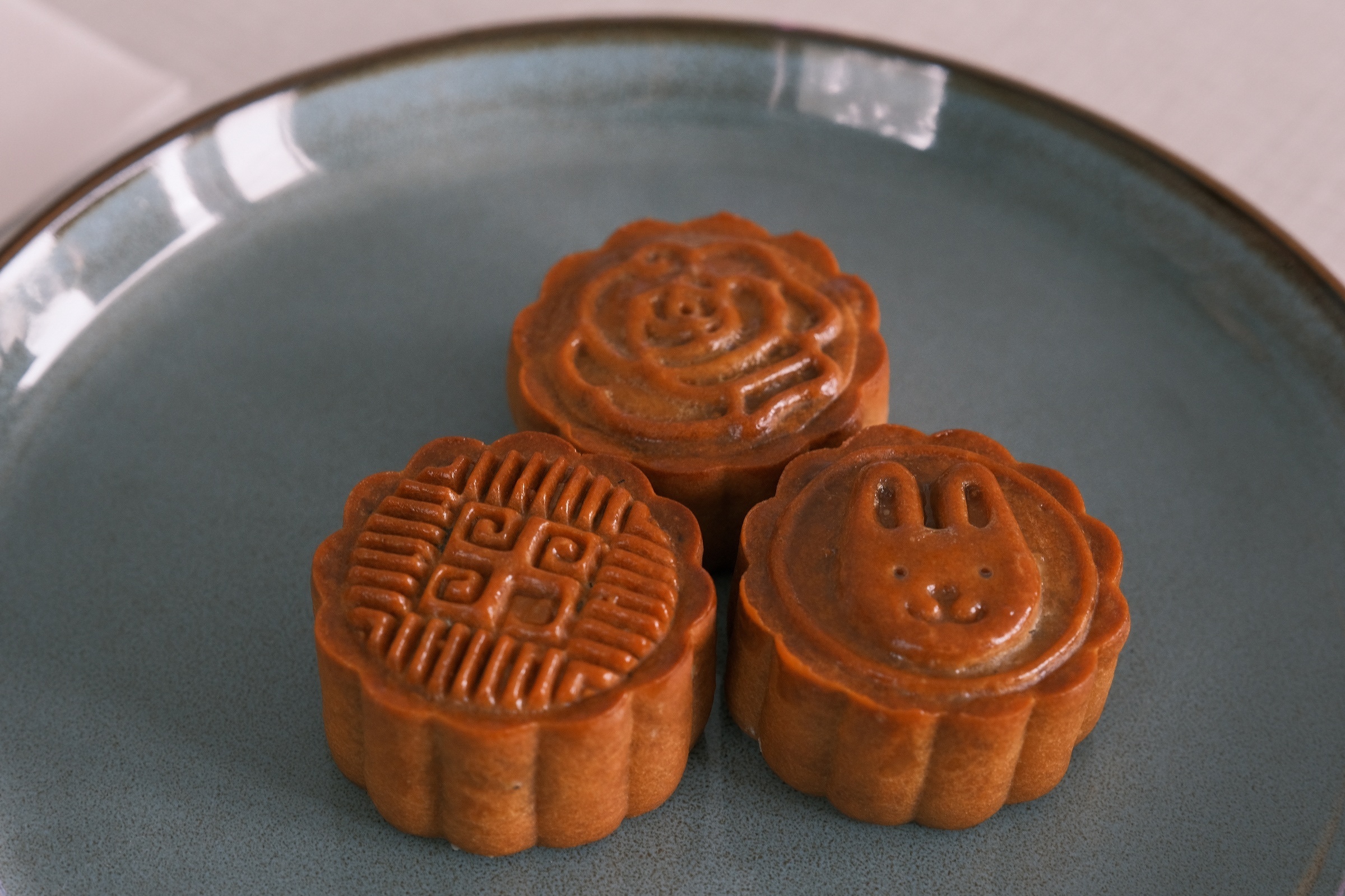 - 使用喷雾器在月饼表面少量喷水