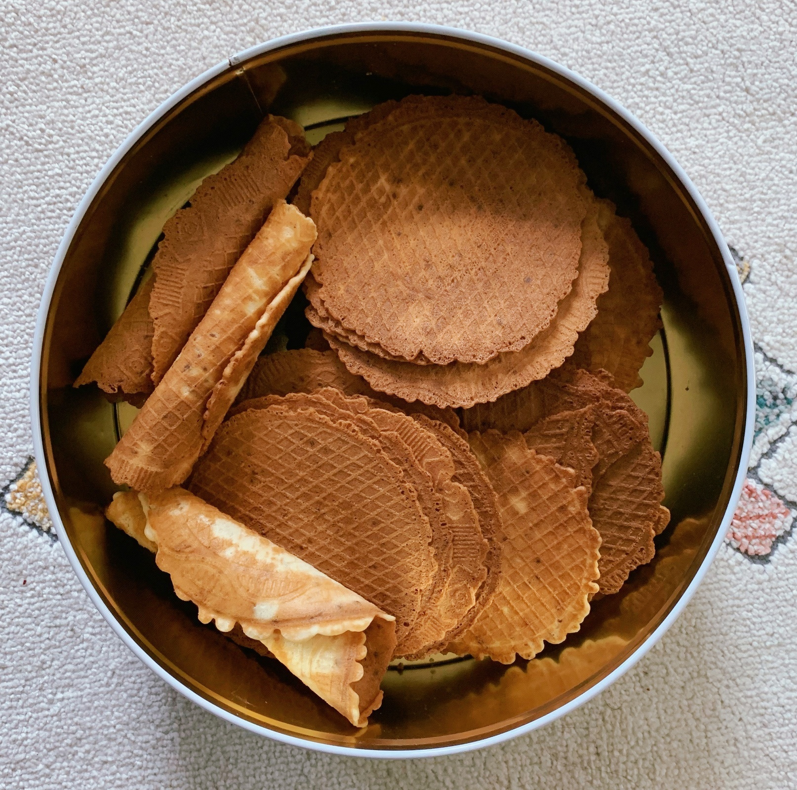 使用华夫饼烙饼机(Ice Cream Waffle Cone Maker)。预热后表面涂抹少量黄油,每次一勺的面糊,稍微按压,烤熟后取出,充分冷却后密封保存。